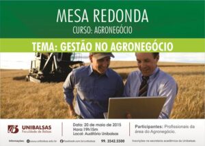O curso de Agronegócio realizará uma Mesa Redonda com o tema Gestão no Agronegócio no dia 20 de Maio de 2015, às 19:15h no Auditório da Unibalsas. O evento contará com a participação de profissionais da área do Agronegócio. As