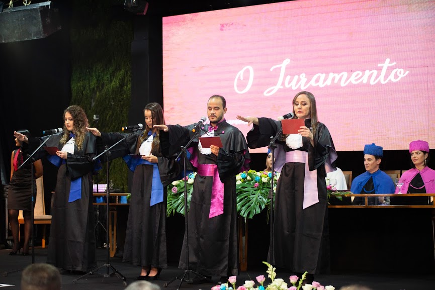 Discursos memoráveis e saudosos, juramento selando um grande compromisso com a sociedade, o grande momento da outorga do grau e a bem comemorada entrega dos canudos.